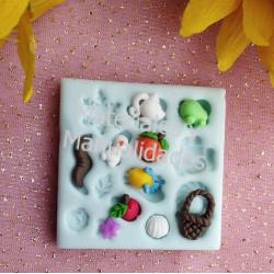 Molde en Silicona frutas y peces, figuras surtidas y canasta apliques en pasta moldeable