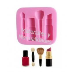 Molde silicona de 4 cavidades que incluyen una brocha doble, esmalte, brocha, y labial.